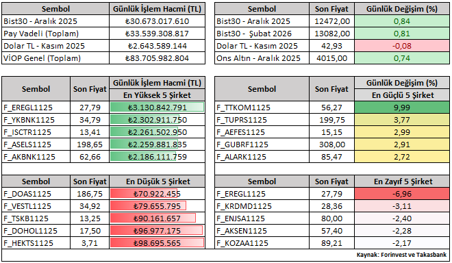 Bist30 Aralık vade sözleşme fiyatı günü yüzde 0,84 yükselişle 12.472 seviyesinden kapattı. Viop tarafında işlem gören şirketlerin günlük performansını (Kasım vade) değerlendirdiğimizde pozitif tarafta yer alan şirketler TTKOM ve TUPRS iken, negatif tarafta yer alan şirketlerse EREGL ve KRDMD olarak kaydedilmiştir.