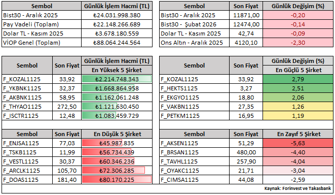 Bist30 Aralık vade sözleşme fiyatı günü yüzde 0,20 düşüşle 11.910 seviyesinden kapattı. Viop tarafında işlem gören şirketlerin günlük performansını (Kasım vade) değerlendirdiğimizde pozitif tarafta yer alan şirketler KOZALL ve HEKTS iken, negatif tarafta yer alan şirketlerse AKSEN ve BRSAN olarak kaydedilmiştir.
