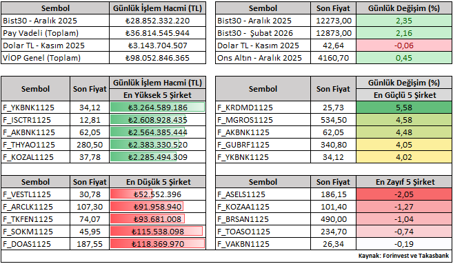 Bist30 Aralık vade sözleşme fiyatı günü yüzde 2,35 yükselişle 12.273 seviyesinden kapattı. Viop tarafında işlem gören şirketlerin günlük performansını (Kasım vade) değerlendirdiğimizde pozitif tarafta yer alan şirketler KRDMD ve MGROS iken, negatif tarafta yer alan şirketlerse ASELS ve KOZAA olarak kaydedilmiştir.