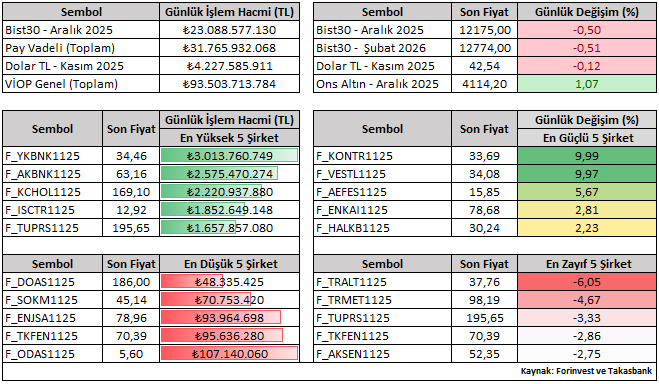 Bist30 Aralık vade sözleşme fiyatı günü yüzde 0,50 düşüşle 12.175 seviyesinden kapattı. Viop tarafında işlem gören şirketlerin günlük performansını (Kasım vade) değerlendirdiğimizde pozitif tarafta yer alan şirketler KONTR ve VESTL iken, negatif tarafta yer alan şirketlerse TRALT ve TRMET olarak kaydedilmiştir.