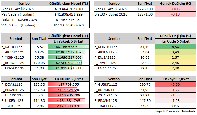 VİOP toplam işlem hacmi 111,68 milyar TL olarak kaydedildi (Bir önceki gün 116,57 milyar TL). Bu hacmin 18,46 milyar TL’si Bist30 endeksi, 41,39 milyar TL’si ise pay vadeliye aittir.