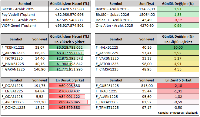 Bist30 Aralık vade sözleşme fiyatı günü yüzde 1,91 yükselişle 12.455 seviyesinden kapattı. Viop tarafında işlem gören şirketlerin günlük performansını (Aralık vade) değerlendirdiğimizde pozitif tarafta yer alan şirketler HALKB ve AKSEN iken, negatif tarafta yer alan şirketlerse TRALT ve GUBRF olarak kaydedilmiştir.