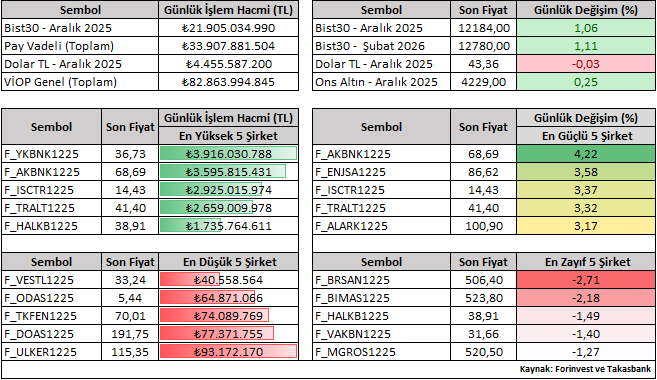 Bist30 Aralık vade sözleşme fiyatı günü yüzde 1,06 yükselişle 12.184 seviyesinden kapattı. Viop tarafında işlem gören şirketlerin günlük performansını (Aralık vade) değerlendirdiğimizde pozitif tarafta yer alan şirketler AKBNK ve ENJSA iken, negatif tarafta yer alan şirketlerse BRSAN ve BIMAS olarak kaydedilmiştir.