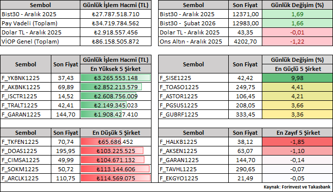 Bist30 Aralık vade sözleşme fiyatı günü yüzde 1,69 yükselişle 12.371 seviyesinden kapattı. Viop tarafında işlem gören şirketlerin günlük performansını (Aralık vade) değerlendirdiğimizde pozitif tarafta yer alan şirketler SISE ve TOASO iken, negatif tarafta yer alan şirketlerse HALKB ve AKSEN olarak kaydedilmiştir.