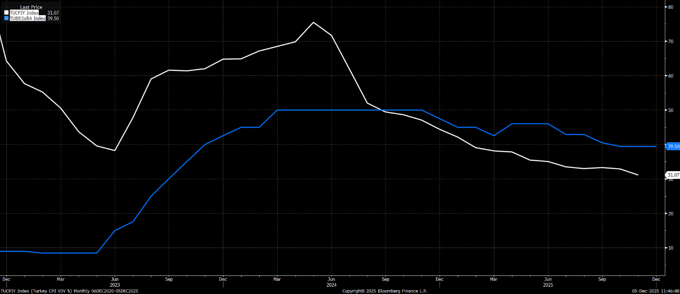 Enflasyon ise Kasım 2025’te 32,87%’den 31,07%’ye gerileyerek, piyasa beklentisine kıyasla daha hızlı bir gevşeme göstermişti. Bu oran aynı zamanda 4 yılın en düşük seviyesi oldu. Aylık TÜFE Ekim’de 2,55%’ken, Kasım’da 0,87% olarak kayda geçti. Yukarıdaki grafikte mavi çizgi politika faizi (bir hafta vadeli repo faizi) ve enflasyon (beyaz) görülebilir.