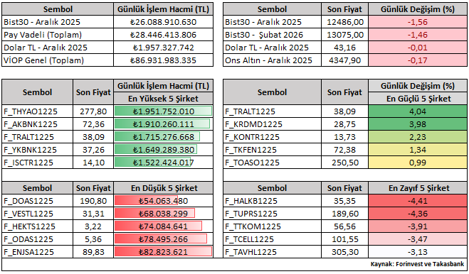 Bist30 Aralık vade sözleşme fiyatı günü yüzde 1,56 düşüşle 12.486 seviyesinden kapattı. Viop tarafında işlem gören şirketlerin günlük performansını (Aralık vade) değerlendirdiğimizde pozitif tarafta yer alan şirketler TRALT ve KRDMD iken, negatif tarafta yer alan şirketlerse HALKB ve TUPRS olarak kaydedilmiştir.