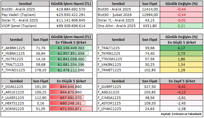 Bist30 Aralık vade sözleşme fiyatı günü yüzde 0,44 düşüşle 12.414 seviyesinden kapattı. Viop tarafında işlem gören şirketlerin günlük performansını (Aralık vade) değerlendirdiğimizde pozitif tarafta yer alan şirketler TRALT ve TKFEN iken, negatif tarafta yer alan şirketlerse GUBRF ve ASELS olarak kaydedilmiştir.
