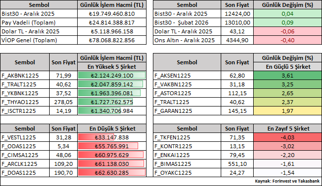 Bist30 Aralık vade sözleşme fiyatı günü yüzde 0,04 yükselişle 12.424 seviyesinden kapattı. Viop tarafında işlem gören şirketlerin günlük performansını (Aralık vade) değerlendirdiğimizde pozitif tarafta yer alan şirketler AKSEN ve VAKBN iken, negatif tarafta yer alan şirketlerse TKFEN ve KONTR olarak kaydedilmiştir.