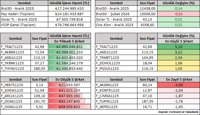 Bist30 Aralık vade sözleşme fiyatı günü yüzde 0,14 yükselişle 12.438 seviyesinden kapattı. Viop tarafında işlem gören şirketlerin günlük performansını (Aralık vade) değerlendirdiğimizde pozitif tarafta yer alan şirketler TRALT ve ASELS iken, negatif tarafta yer alan şirketlerse AKSEN ve KONTR olarak kaydedilmiştir.