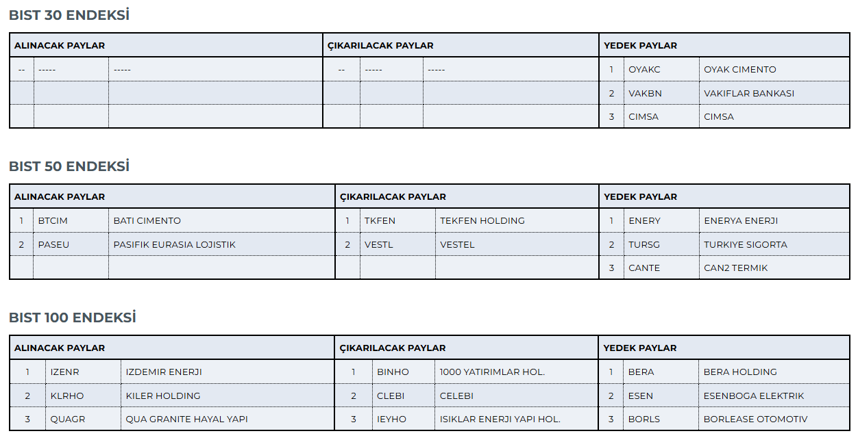 BIST Piyasa Değeri Ağırlıklı Pay Endeksleri Kural Seti dikkate alınarak yapılan BIST 30, BIST 50, BIST 100, BIST 500, BIST Likit Banka, BIST Banka Dışı Likit 10, BIST Sürdürülebilirlik ve BIST Sürdürülebilirlik 25 endeksleri dönemsel değerleme çalışması tamamlanmıştır.
