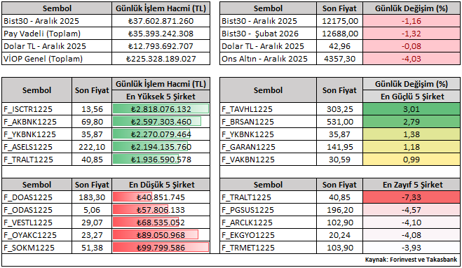 Bist30 Aralık vade sözleşme fiyatı günü yüzde 1,16 düşüşle 12.715 seviyesinden kapattı. Viop tarafında işlem gören şirketlerin günlük performansını (Aralık vade) değerlendirdiğimizde pozitif tarafta yer alan şirketler TAVHL ve BRSAN iken, negatif tarafta yer alan şirketlerse TRALT ve PGSUS olarak kaydedilmiştir.