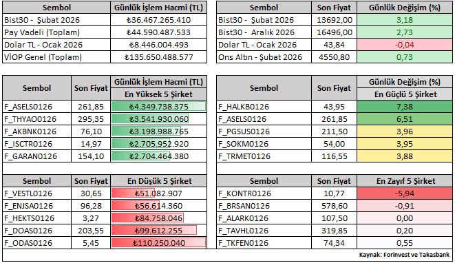 Bist30 Şubat vade sözleşme fiyatı günü yüzde 3,18 yükselişle 13.692 seviyesinden tamamladı. Günlük performanslara bakıldığında, Ocak vade kontratlar içerisinde HALKB ve ASELS pozitif ayrışırken; KONTR ve BRSAN negatif tarafta öne çıkan hisseler oldu.