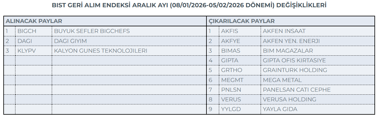BIST Piyasa Değeri Ağırlıklı Pay Endeksleri Kural Seti uyarınca Borsa İstanbul Genel Müdürlüğünce; BIST Geri Alım Endeksi kapsamında 2026 yılı Ocak ayı için (08/01/2026-05/02/2026) değişikliklerin yapılmasına karar verilmiştir.