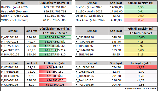 Bist30 Şubat vade sözleşme fiyatı günü yüzde 1,53 yükselişle 14.082 seviyesinden tamamladı. Günlük performanslara bakıldığında, Ocak vade kontratlar içerisinde ASTOR ve BRSAN pozitif ayrışırken; GUBRF ve VAKBN negatif tarafta öne çıkan hisseler oldu.