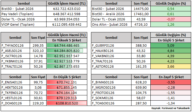 Bist30 Şubat vade sözleşmesi günü yüzde 0,54 yükselişle 14.475 seviyesinden tamamladı. Günlük performanslara bakıldığında, Ocak vade kontratlar içerisinde GUBRF ve HALKB pozitif ayrışırken; BIMAS ve MGROS negatif tarafta öne çıkan hisseler oldu.