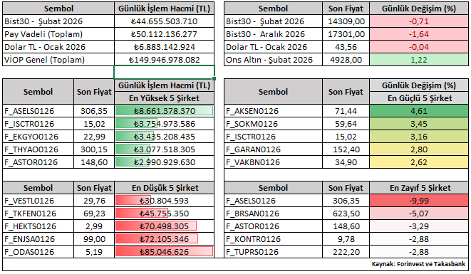 Bist30 Şubat vade sözleşmesi günü yüzde 0,71 düşüşle 14.309 seviyesinden tamamladı. Günlük performanslara bakıldığında, Ocak vade kontratlar içerisinde AKSEN ve SOKM pozitif ayrışırken; ASELS ve BRSAN negatif tarafta öne çıkan hisseler oldu.