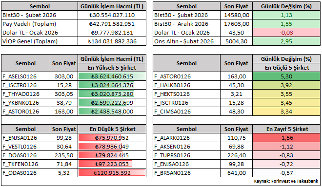 Bist30 Şubat vade sözleşmesi günü yüzde 1,13 yükselişle 14.580 seviyesinden tamamladı. Günlük performanslara bakıldığında, Ocak vade kontratlar içerisinde ASTOR ve HALKB pozitif ayrışırken; ALARK ve AKSEN negatif tarafta öne çıkan hisseler oldu.