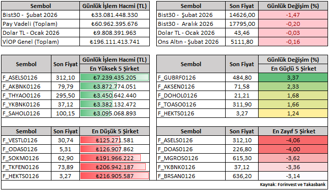 Bist30 Şubat vade sözleşmesi günü yüzde 1,47 düşüşle 14.626 seviyesinden tamamladı. Günlük performanslara bakıldığında, Ocak vade kontratlar içerisinde AKSEN ve GUBRF pozitif ayrışırken; ASELS ve DOAS negatif tarafta öne çıkan hisseler oldu.