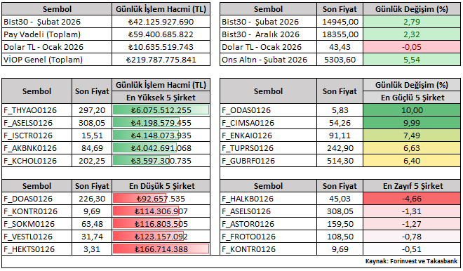 Bist30 Şubat vade sözleşmesi günü yüzde 2,79 düşüşle 14.945 seviyesinden tamamladı. Günlük performanslara bakıldığında, Ocak vade kontratlar içerisinde ODAS ve CIMSA pozitif ayrışırken; HALKB ve ASELS negatif tarafta öne çıkan hisseler oldu.