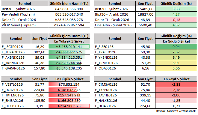 Bist30 Şubat vade sözleşmesi günü yüzde 3,33 yükselişle 15.485 seviyesinden tamamladı. Günlük performanslara bakıldığında, Ocak vade kontratlar içerisinde SISE ve TRALT pozitif ayrışırken; CIMSA ve TKFEN negatif tarafta öne çıkan hisseler oldu.