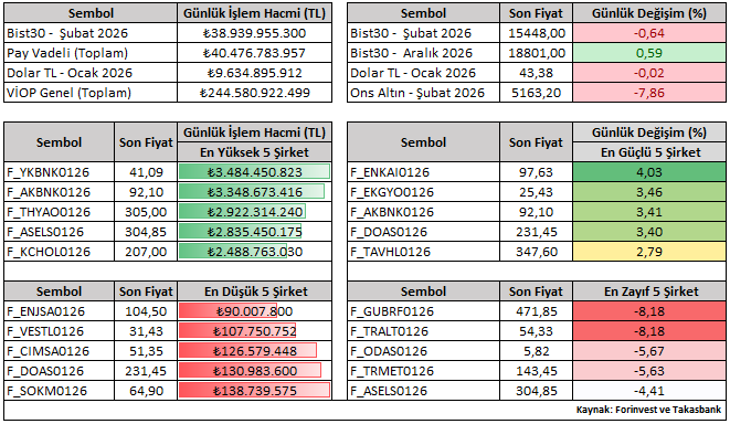 Bist30 Şubat vade sözleşmesi günü yüzde 0,64 düşüşle 15.448 seviyesinden tamamladı. Günlük performanslara bakıldığında, Ocak vade kontratlar içerisinde ENKAI ve EKKGO pozitif ayrışırken; GUBRF ve TRALT negatif tarafta öne çıkan hisseler oldu.