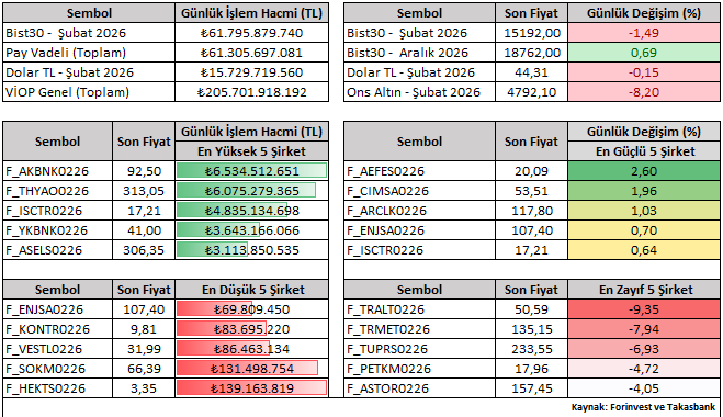 Bist30 Şubat vade sözleşmesi günü yüzde 1,49 düşüşle 15.192 seviyesinden tamamladı. Günlük performanslara bakıldığında, Şubat vade kontratlar içerisinde AEFES ve CIMSA pozitif ayrışırken; TRALT ve TRMET negatif tarafta öne çıkan hisseler oldu.