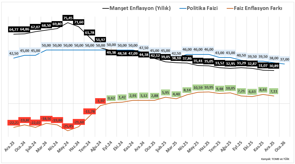 Yıllık enflasyonun 31%’in altına gerilemesi faiz indirimi için alan oluşturmuştu. Gıda ve hizmet fiyatlarındaki hızlanma risk oluştururken, buna rağmen Ocak ayında enflasyonun 30% çevresinde oluşabileceği tahmin ediliyor. Buna da 4,3% civarındaki aylık TÜFE değişiminin eşlik etmesi bekleniyor.