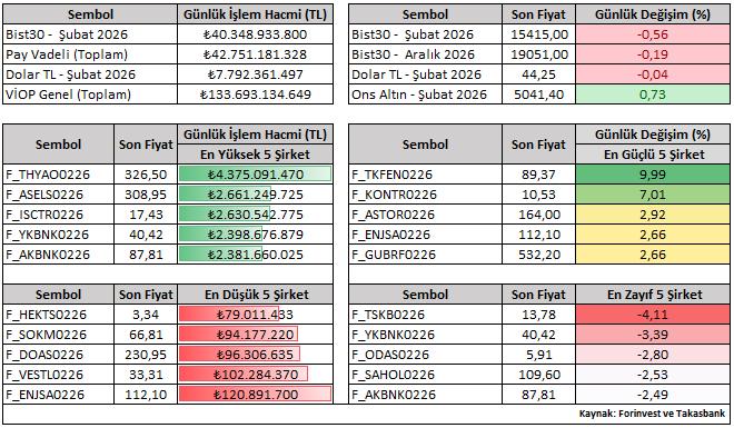 Bist30 Şubat vade sözleşmesi günü yüzde 0,56 düşüşle 15.415 seviyesinden tamamladı. Günlük performanslara bakıldığında, Şubat vade kontratlar içerisinde TKFEN ve KONTR pozitif ayrışırken; YKBNK ve TSKB negatif tarafta öne çıkan hisseler oldu.