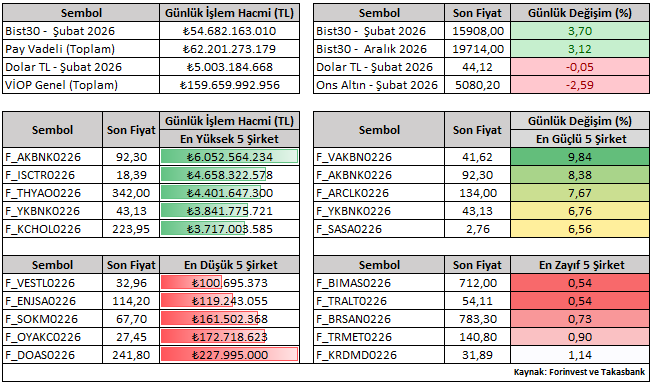Bist30 Şubat vade sözleşmesi günü yüzde 3,70 yükselişle 15.908 seviyesinden tamamladı. Günlük performanslara bakıldığında, Şubat vade kontratlar içerisinde VAKBN ve AKBNK pozitif ayrışırken; BIMAS ve TRALT en az reaksiyon ile öne çıkan hisseler oldu.