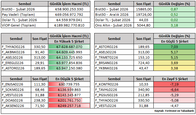 Bist30 Şubat vade sözleşmesi günü 0,87 yükselişle 15.865 seviyesinden tamamladı. Günlük performanslara bakıldığında, Şubat vade kontratlar içerisinde ASTOR ve ASELS pozitif ayrışırken; KONTR ve TAVHL negatif reaksiyon ile öne çıkan hisseler oldu.