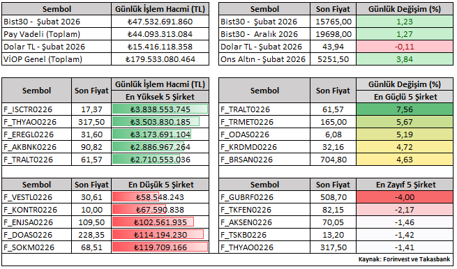 Bist30 Şubat vade sözleşmesi günü 1,23 yükselişle 15.765 seviyesinden tamamladı. Günlük performanslara bakıldığında, Şubat vade kontratlar içerisinde TRALT ve TRMET pozitif ayrışırken; GUBRF ve TKFEN negatif reaksiyon ile öne çıkan hisseler oldu.