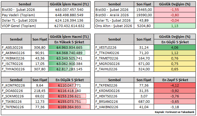 Bist30 Şubat vade sözleşmesi günü 1,55 düşüşle 15.465 seviyesinden tamamladı. Günlük performanslara bakıldığında, Şubat vade kontratlar içerisinde VESTL ve TTKOM pozitif ayrışırken; TKFEN ve KRDMD negatif reaksiyon ile öne çıkan hisseler oldu.
