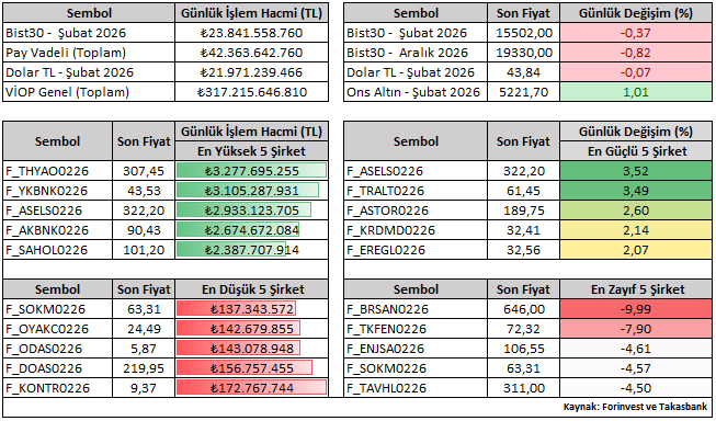 Bist30 Şubat vade sözleşmesi günü %0,37 düşüşle 15.502 seviyesinden tamamladı. Günlük performanslara bakıldığında, Şubat vade kontratlar içerisinde ASELS ve TRALT pozitif ayrışırken; BRSAN ve TKFEN negatif reaksiyon ile öne çıkan hisseler oldu.