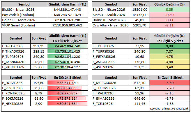 Bist30 Nisan vade sözleşmesi günü %0,05 yükselişle 15.301 seviyesinden tamamladı. Günlük performanslara bakıldığında, Mart vade kontratlar içerisinde TKFEN ve TUPRS pozitif ayrışırken; MGROS ve TTKOM negatif reaksiyon ile öne çıkan hisseler oldu.