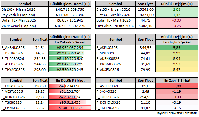 Bist30 Nisan vade sözleşmesi günü %2,03 yükselişle 15.542 seviyesinden tamamladı. Günlük performanslara bakıldığında, Mart vade kontratlar içerisinde SISE ve ASELS pozitif ayrışırken; ASTOR ve SASA negatif reaksiyon ile öne çıkan hisseler oldu.