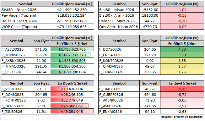 Bist30 Nisan vade sözleşmesi günü %1,04 düşüşle 15.152 seviyesinden tamamladı. Günlük performanslara bakıldığında, Mart vade kontratlar içerisinde DOAS ve ENJSA pozitif ayrışırken; TRALT ve GUBRF negatif reaksiyon ile öne çıkan hisseler oldu.