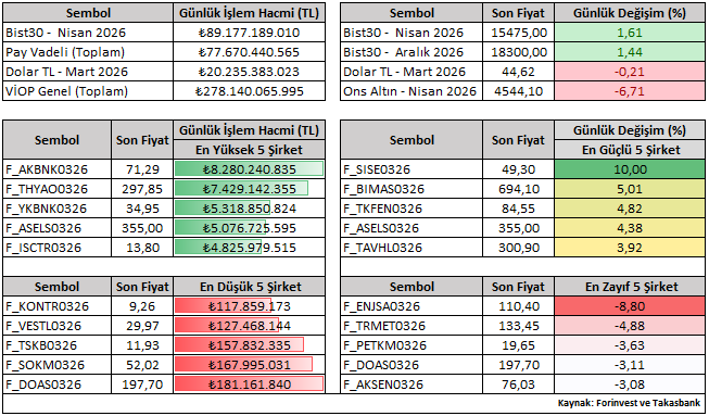 VİOP toplam işlem hacmi 278,14 milyar TL olarak kaydedildi (Bir önceki gün 79,11 milyar TL). Toplam hacmin 89,18 milyar TL’lik kısmı BIST30 endeks kontratlarından, 77,67 milyar TL’lik bölümü ise pay vadeli kontratlardan karşılanmaktadır.