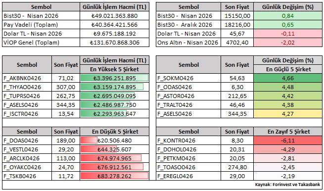 Bist30 Nisan vade sözleşmesi günü %0,84 yükselişle 15.150 seviyesinden tamamladı. Günlük performanslara bakıldığında, Nisan vade kontratlar içerisinde SOKM ve ODAS pozitif ayrışırken; KONTR ve DOHOL negatif reaksiyon ile öne çıkan hisseler oldu.