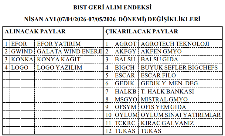 BIST Geri Alım Endeksi Dönemsel Değişiklikleri açıklandı.