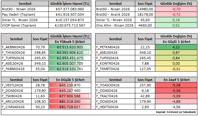 VİOP toplam işlem hacmi 130,68 milyar TL olarak kaydedildi (Bir önceki gün 108,09 milyar TL). Toplam hacmin 57,38 milyar TL’lik kısmı BIST30 endeks kontratlarından, 41,92 milyar TL’lik bölümü ise pay vadeli kontratlardan karşılanmaktadır.