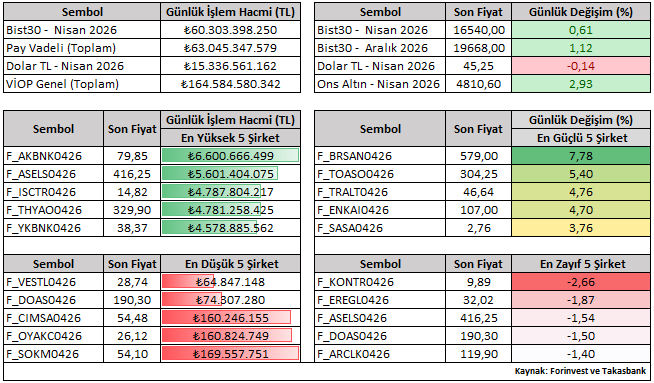 Bist30 Nisan vade sözleşmesi günü %0,61 yükselişle 16.540 seviyesinden tamamladı. Günlük performanslara bakıldığında, Nisan vade kontratlar içerisinde BRSAN ve TOASO pozitif ayrışırken; KONTR ve EREGL negatif reaksiyon ile öne çıkan hisseler oldu.