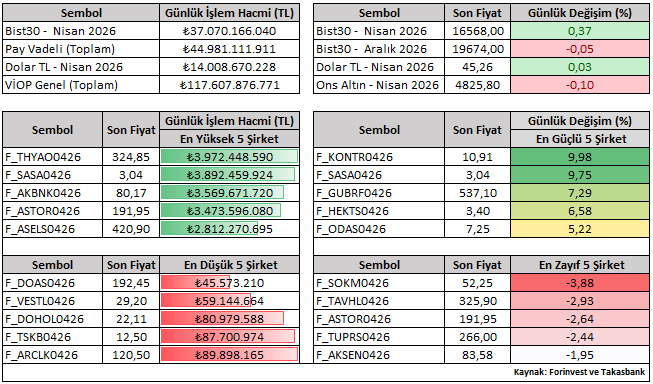 Bist30 Nisan vade sözleşmesi günü %0,37 yükselişle 16.568 seviyesinden tamamladı. Günlük performanslara bakıldığında, Nisan vade kontratlar içerisinde KONTR ve SASA pozitif ayrışırken; SOKM ve TAVHL negatif reaksiyon ile öne çıkan hisseler oldu.