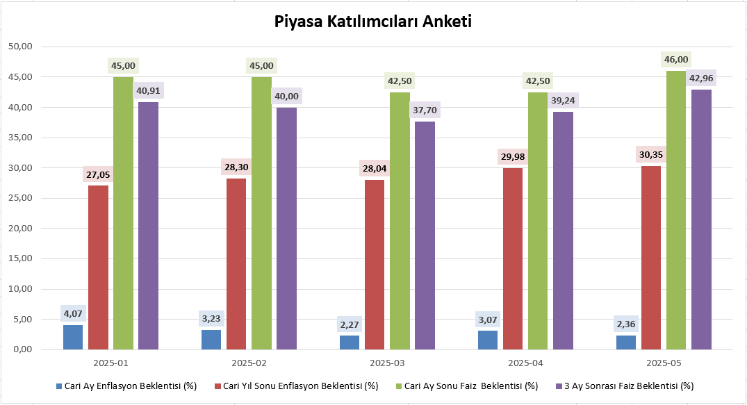 Nisan ayı enflasyon verileri piyasa beklentilerinin altında kalsa da, TCMB’nin Mayıs 2025 Piyasa Katılımcıları Anketi'nde yıl sonu enflasyon tahmininin %29,98’den %30,35’e yükselmiş olması dikkat çekti. Aynı ankette cari ay sonu politika faizi beklentisi %46 seviyesinde sabit kaldı. Öte yandan, Mayıs ayında açıklanan enflasyon verileri piyasa medyan beklentisinin oldukça altında kalarak aylık bazda %1,53, yıllık bazda ise %35,41 olarak gerçekleşti. Şimdi gözler, bu veriler ışığında Haziran ayı Piyasa Katılımcıları Anketi'nde yapılacak olası revizyonlara çevrilmiş durumda.