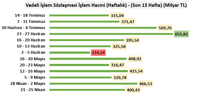 Son 13 haftanın en yüksek hacimsel performansı 23 – 27 Haziran tarihinde 655,82, en düşük hacimsel performans ise 2 – 5 Haziran haftasındaki 214,14 milyar TL olmayı sürdürmektedir.