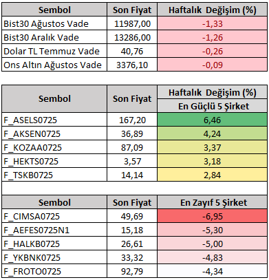 Hacimsel kıyaslamalardan 14 - 18 Temmuz haftasına yönelik performanslara (%) geçtiğimizde Bist30 Ağustos vade sözleşme fiyatı haftayı yüzde 1,33 düşüşle 11.987 seviyesinden kapattı. Viop tarafında işlem gören şirketlerin haftalık performansını (Temmuz vade) değerlendirdiğimizde pozitif tarafta en fazla dikkat çekenler ASELS ve AKSEN olurken negatif tarafta dikkat çeken şirketlerse CIMSA ve AEFES olarak kaydedilmiştir.
