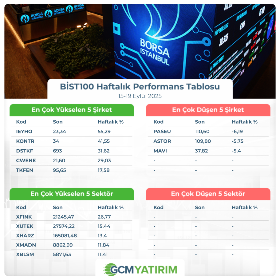 Haftalık bazda en iyi şirket performansı yüzde 55,29 yükselişle IEYHO, yüzde 41,55 yükselişle KONTR ve yüzde 31,62 yükselişle DSTKF tarafında gerçekleşirken en kötü performanslarsa yüzde 6,19 düşüşle PASEU yüzde 5,75 düşüşle ASTOR ve yüzde 5,40 düşüşle MAVI tarafında gerçekleşti