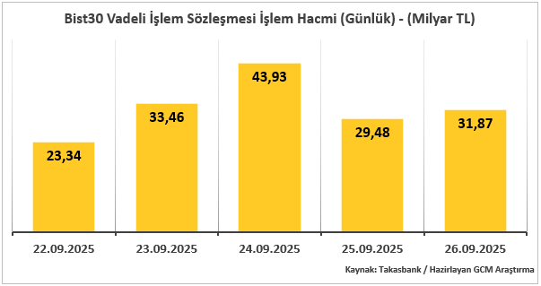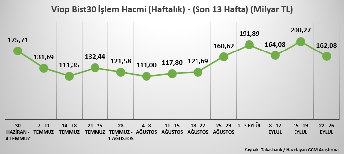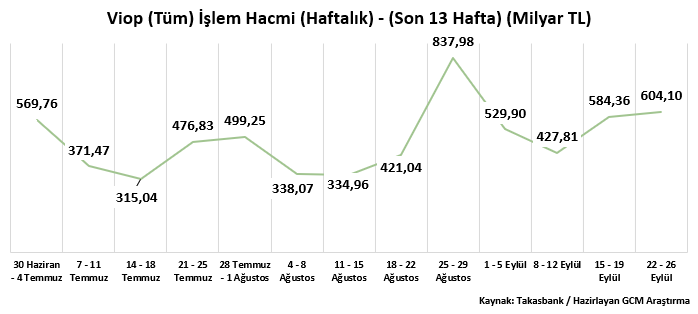 22 - 26 Eylül 2025 haftasına yönelik VİOP toplam işlem hacmi 604,10 milyar TL olarak kaydedilmiştir. Bu tutar bir önceki haftaki 584,36 milyar TL ile kıyaslandığında hacimsel açıdan kısmi yükseliş izlenmektedir. Son 13 haftanın en yüksek hacimsel performansı 25 – 29 Ağustos haftasındaki 837,98 milyar TL, en düşük hacimsel performans ise 14 – 18 Temmuz haftasındaki 315,04 milyar TL olmayı sürdürmektedir.