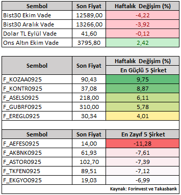22 - 26 Eylül haftasına yönelik değişimlere (%) geçtiğimizde; Bist30 Ekim vade sözleşme fiyatı haftayı yüzde 4,22 düşüşle 12.589 seviyesinden kapattı. Viop tarafında işlem gören şirketlerin haftalık performansını (Eylül vade) değerlendirdiğimizde, pozitif tarafta dikkat çeken şirketler KOZAA ve KONTR olurken, negatif tarafta dikkat çekenlerse AEFES ve AKBNK olarak kaydedilmiştir.