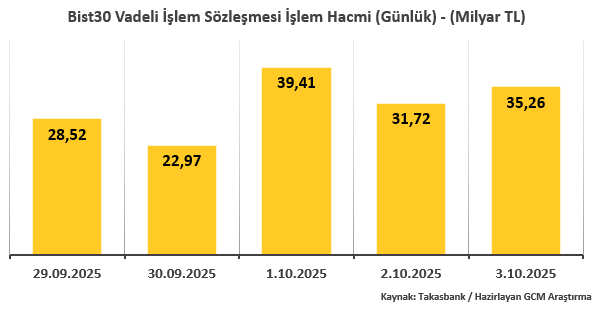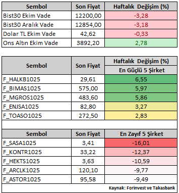 29 Eylül – 03 Ekim 2025 haftasına yönelik değişimlere (%) geçtiğimizde; Bist30 Ekim vade sözleşme fiyatı haftayı yüzde 3,28 düşüşle 12.200 seviyesinden kapattı. Viop tarafında işlem gören şirketlerin haftalık performansını (Eylül vade) değerlendirdiğimizde, pozitif tarafta dikkat çeken şirketler HALKB ve BIMAS olurken, negatif tarafta dikkat çekenlerse SASA ve KONTR olarak kaydedilmiştir.