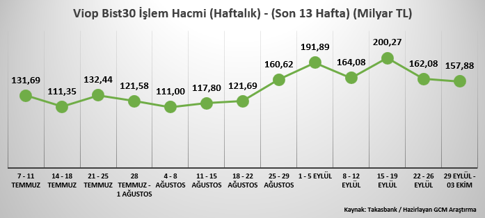 584,36 milyar TL toplam hacmin 157,88 milyar TL’si ise endeks olarak kaydedilmiştir. Geçtiğimiz hafta bu oran 162,08 milyar TL idi. Son 13 haftanın en yüksek hacimsel performansı 15 – 19 Eylül haftasındaki 200,27 milyar TL, en düşük hacimsel performans ise 10 – 13 Haziran haftasındaki 103,70 milyar TL olmayı sürdürmektedir.